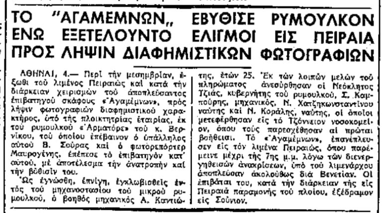 In an attempt to capture a striking photograph of the large passenger vessel, the tug approached dangerously close to its bow. This decision proved fatal. The Armadores was struck by the very ship it was assisting, and the collision caused it to sink within minutes. Most of the crew managed to abandon the vessel in time, including the captain and three crew members. Tragically, a 25-year-old assistant engineer was trapped in the engine room and went down with the tug. The incident remains one of the most unusual maritime accidents recorded in Greece, as it is believed to be the only known case of a vessel sinking during a staged photographic maneuver.